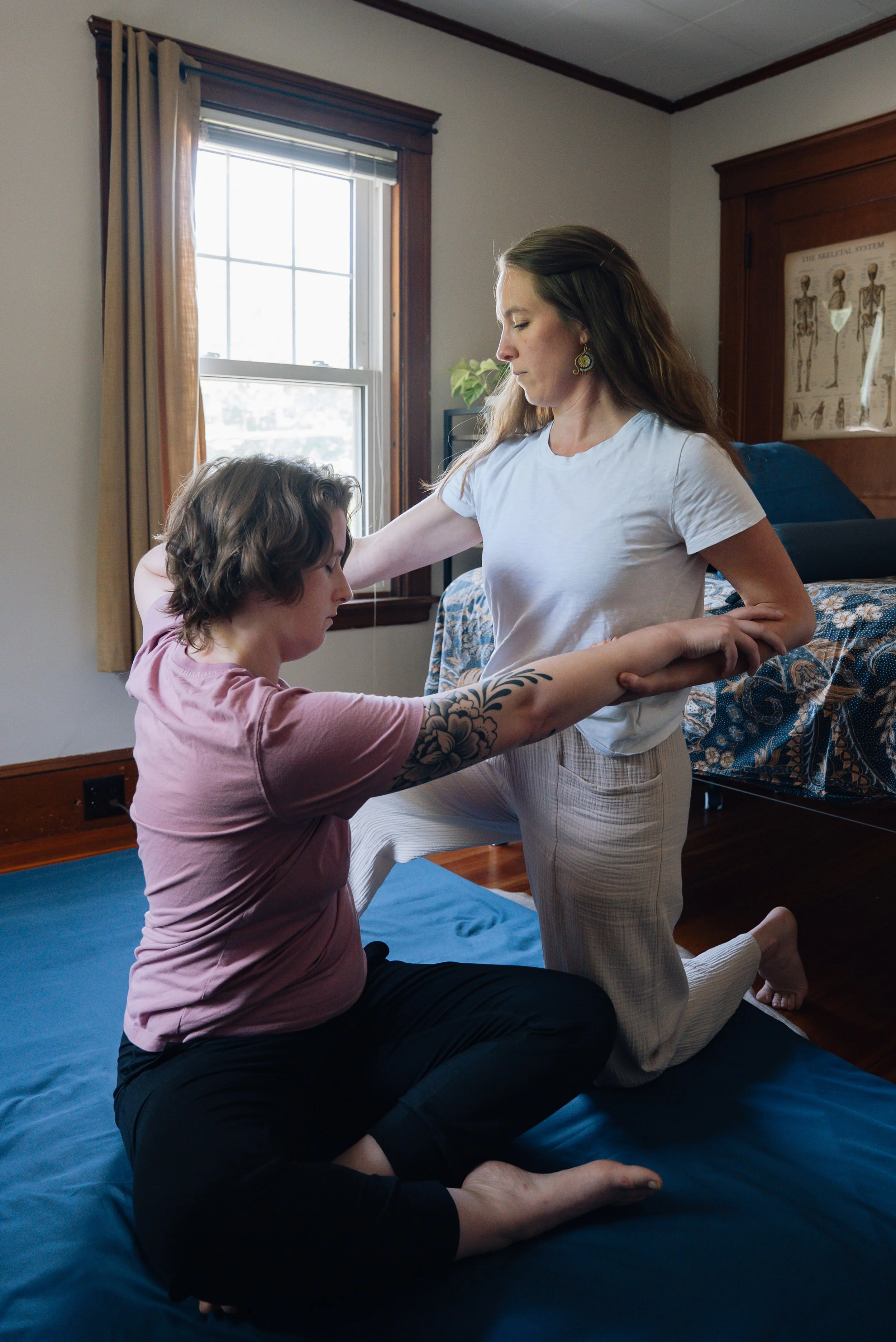 Treatments are offered on a soft floor mat and clients wear loose, comfortable clothing (yoga pants are okay), that allows for full range of motion and access to skin when application of balms, linaments, cupping or scraping techniques may be indicated.